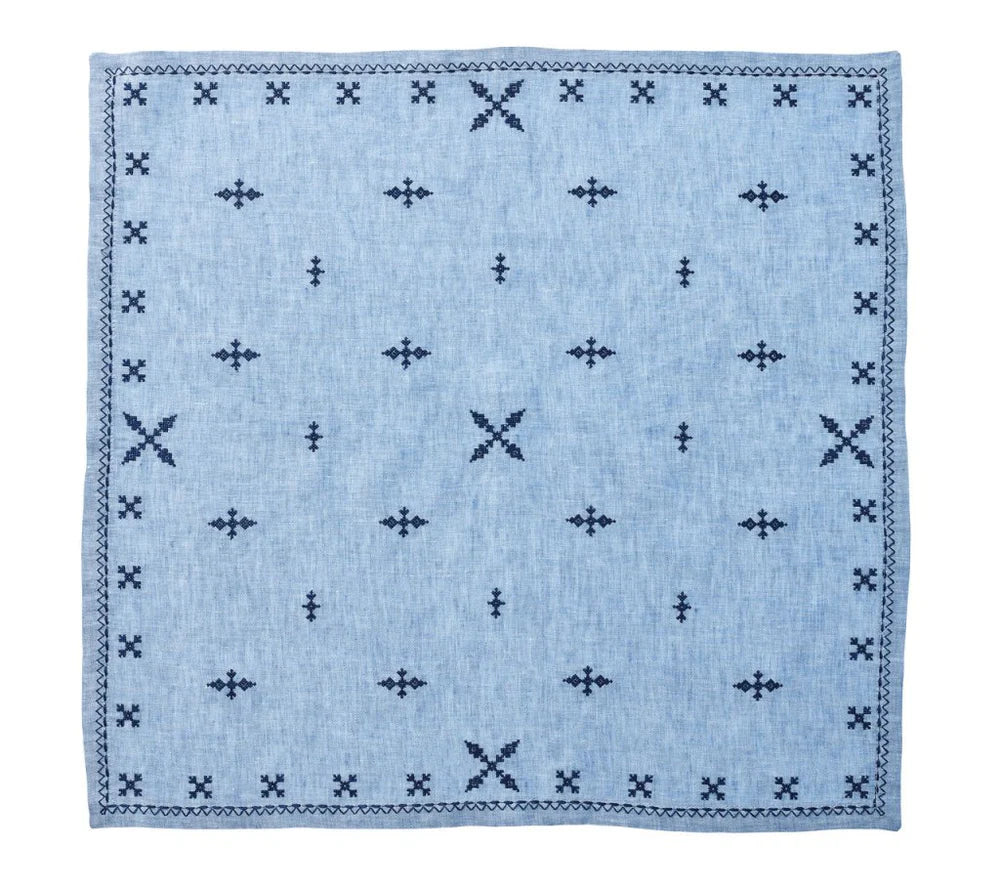 Inspired by the richness of traditional Moroccan embroidery, the linen Fez Napkin features embroidered shapes in navy that are arranged in a carefully thought-out symmetrical pattern. The periwinkle napkin also has a striped navy border that anchors the design.
